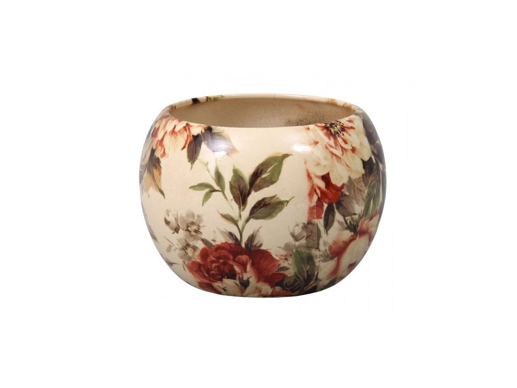 Keramický glazovaný lesklý kulatý obal s barevným potiskem po celé vnější ploše. Potisk je složen ze světlých květů řůže i s listy v sepiovém nádechu. Použití do interiérů na květináče s rostlinami. Rozměr: š. celková 13 cm, š. horní okraj 10,5 cm, výška 11 cm. Barva: béžová lesklá s květinovým potiskem.Doplňkové parametry