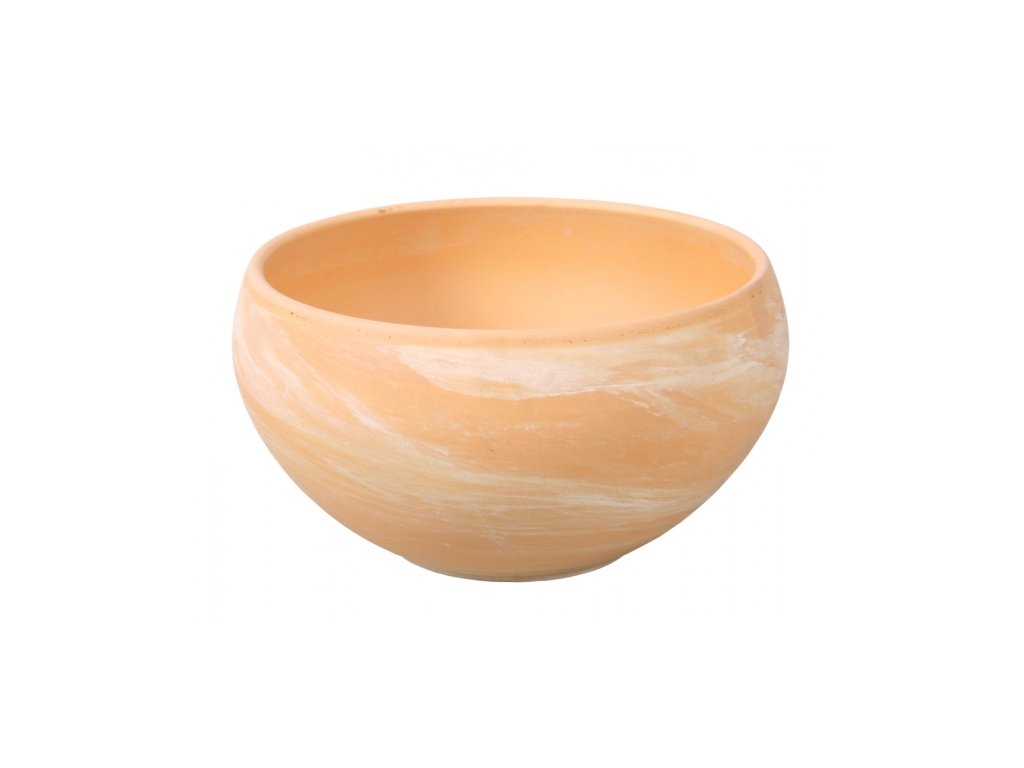 Impregnovaná keramická žardinka, která se kónicky rozevírá a ke konci opět uzavírá. Vyrobena z kvalitní pálené hlíny ve světlé terakotové barvě s béžovým melírem. Barevné odstíny jsou u každého kusu originální a jdou od terakotové až po béžovou. Záleží na složení a promíchání jílu. Vhodná zejména do interiéru, bez otvoru. Průměr: 19 cm, výška: 10 cm. Barva: mramor béžový melír.Doplňkové parametry