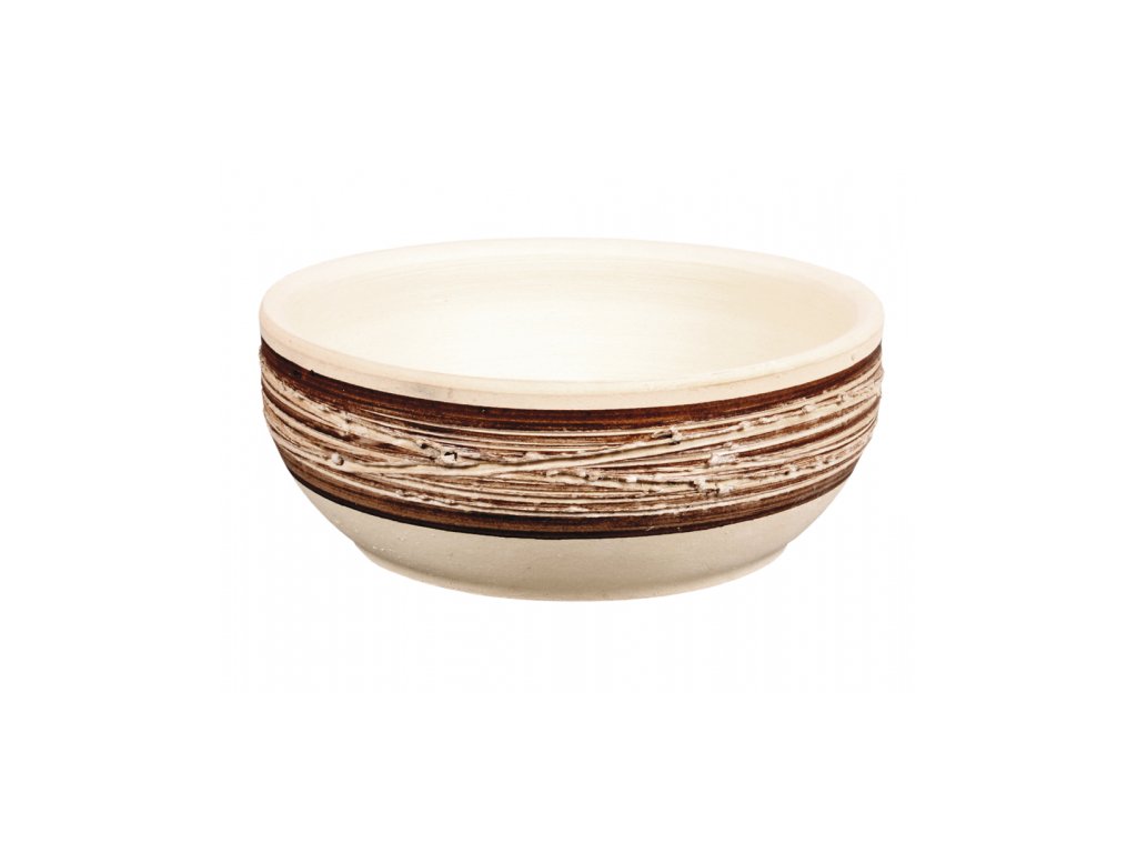 Keramická béžová žardinka se zdobením po obvodu ve 2/3 výšky. Vedou zde 2 hnědé glazované cca 1cm široké proužky, mezi kterými je bíle glazovaný pruh tvoření nepravidelnými vrypy vedenými po obvodu. Květník má užší základnu, poté se prudce rozevře a stává se téměr pravidelným válcem zakončeným vystouplejším lemem. Květník je vhodný do interiéru i exteriéru. Šířka: 20 cm, výška: 8 cm, hloubka: 20 cm. Vhodnou podmiskou je CAMPANULA, NG 053845hb.Doplňkové parametry