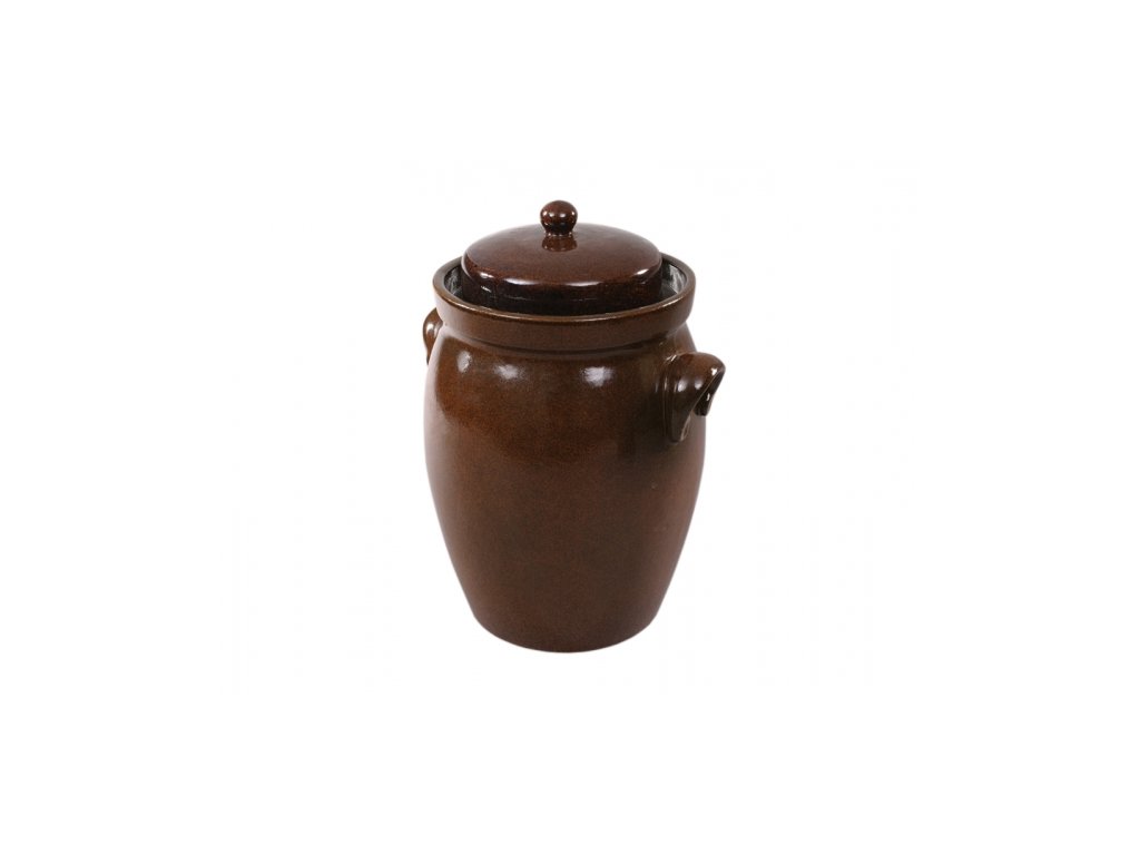 Keramický glazovaný hnědý lesklý 7l zelák s víkem a s uchy. Zelák je v půdorysu kruhový. Tvar má kónický, kdy se v horní části, kde jsou připevněná keramická ucha začne opět uzavírat. Horní ohraj je poté kolmý rovný pruh. Na něm je položené víko. Zelák se používá ke kvašení a skladování zelí a pro jinou podobně zpracovanou zeleninu. Rozměry: d. 24,5 x v. 28,5cm.Doplňkové parametry