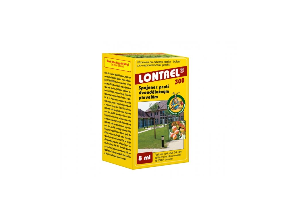 Lontrel 300 je selektivní herbicid s vodou mísitelný kapalný koncentrát. Používá se k ničení plevele zejména heřmánků, heřmánkovců, pcháčů v obilovinách bez podsevu, kukuřici, řepce olejné, cukrovce, krmné řepě, lnu, jahodách a k hubení turanu kanadského v sadech a dvouděložných plevelů včetně sedmikrásek v okrasných trávnících. Obsah: Clopyralid 300 g/l.Doplňkové parametry