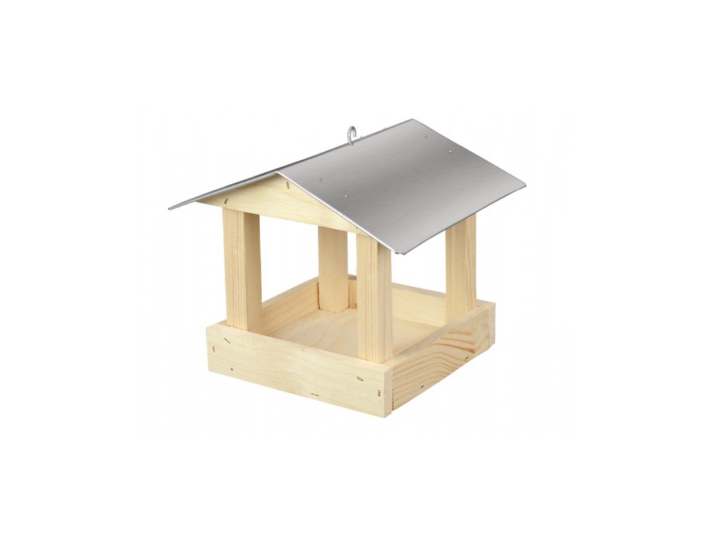 Dřevěné krmítko pro ptáky s pozinkovanou střechou. Výška: 20 cm, šířka: 24 cm, hloubka: 24 cm.Doplňkové parametry