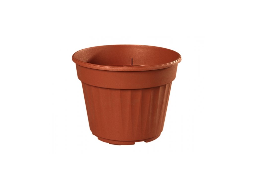 Plastový lehčený matný květník v barvě terakoty s vylisovanými svislými vlnkami téměř po celé výšce. Pod okrajem je rovný pruh, který je nahoře zakončen okrajem ohnutým směrem ven. Vhodný pro výsadbu rostlin v interiéru i v exteriéru. Rozměry: d. 26 x 22cm.Doplňkové parametry