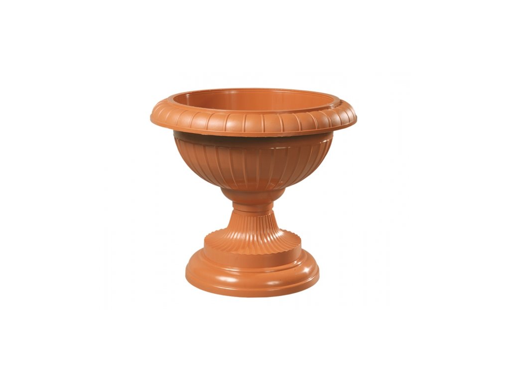 Plastová číše v terakotové barvě v části s vertikálně vylisovanými pruhy, jak na podstavci, tak na samotné číši. Horní okraj má širší, ohnutý směrem ven. Podstavec je s kruhovou základnou. Používá se pro výsadbu rostlin v exteriéru i v interiéru. Rozměry: d. 34 x v. 30cm.Doplňkové parametry