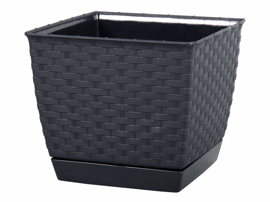 Hranatý plastový obal na květník věrně imituje ratanový výplet. Elegantní motiv je vhodný do interiéru, na terasy i balkóny. Barva: antracitová. Šířka: 19 cm, výška: 16 cm, hloubka: 19 cm.Doplňkové parametry