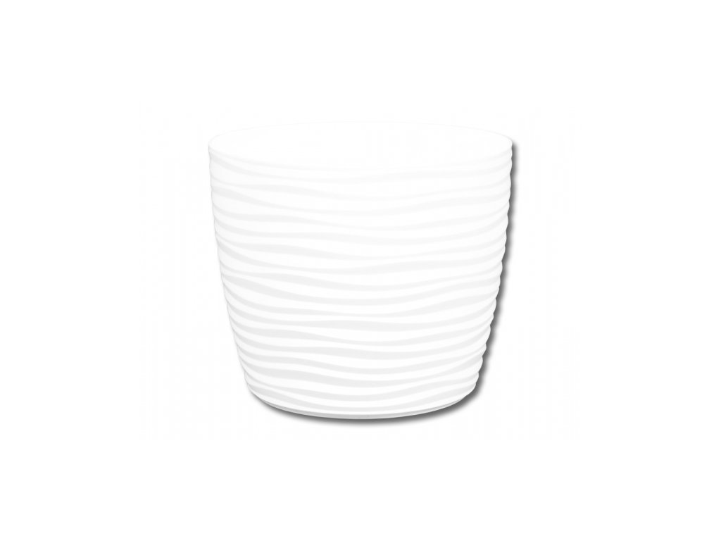 Matný plastový obal na květník s jemnými vlnkami po celém obvodu. Průměr: 17 cm, výška: 14 cm.Doplňkové parametry