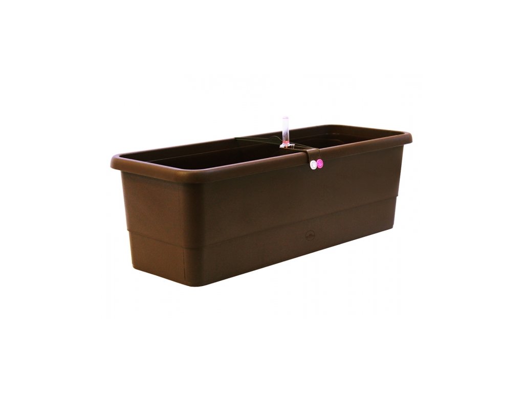 Exkluzivní masivní samozavlažovací hnědý truhlík pro velký objem zeminy s knotem provlečeným roštem, s měrkou a se dvěma datumovkami pro zapamatování data zálivky a data přihnojování. S dvoukomorovým prostorem pro zálivku. S možností odříznutí odtokového otvoru pro odtok části zálivky při přelití deštěm. SMART SYSTEM je opatřen otvory pro vhodné umístění napájecího dílu. Truhlík se hodí zejména pro výsadbu balkonových rostlin a k umístění na terasy, balkóny, lodžie, k zavěšení na zábradlí a pod. Truhlík je masivní s rozměry: dl. 60 x š. 22,5 x v. 19,5cm.Doplňkové parametry