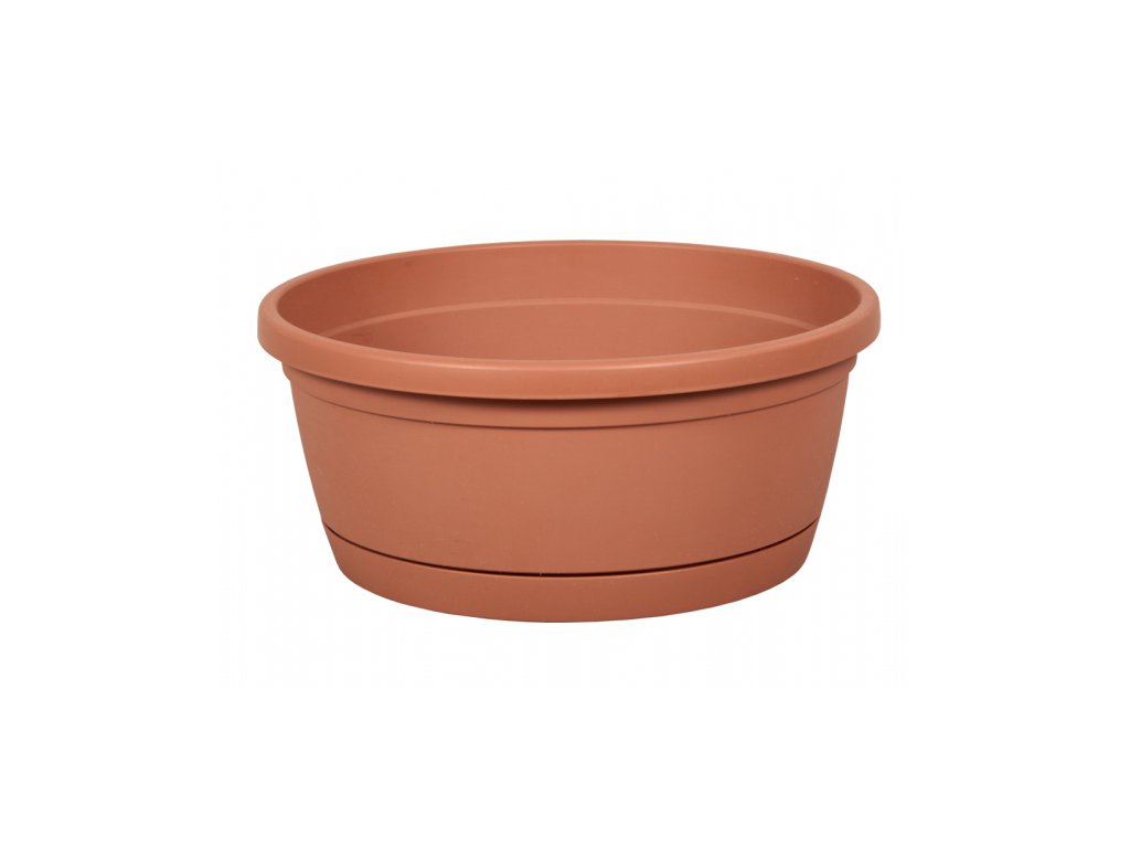 Hladká, matná žardinka s podmiskou má elegantní, jednoduchý design. Je vyrobena z lehkého, 100% recyklovatelného plastu. Je odolná vůči UV záření, vůči mrazu do -20° C. Barva: terakota. Průměr: 30 cm výška: 13 cm.Doplňkové parametry