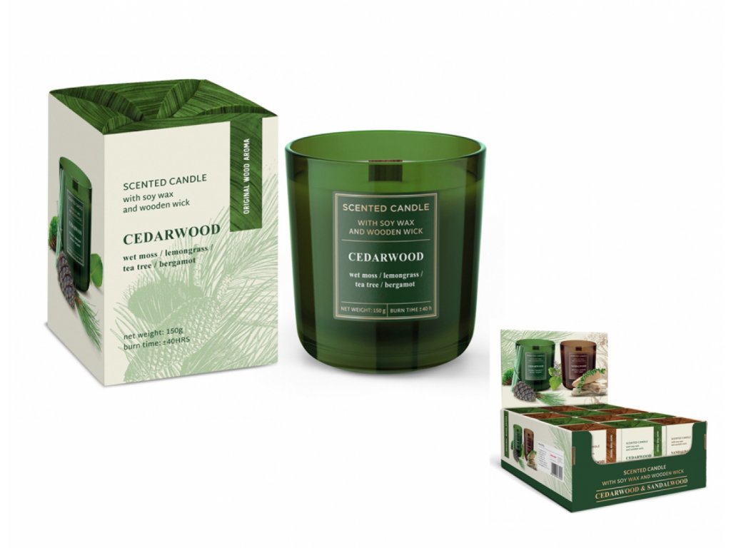 Vonná svíčka ve skle balená v krabičce s potiskem. Vůně: cedrového dřeva. Doba hoření: 40 hod. Hmotnost náplně: 150 g.Doplňkové parametry