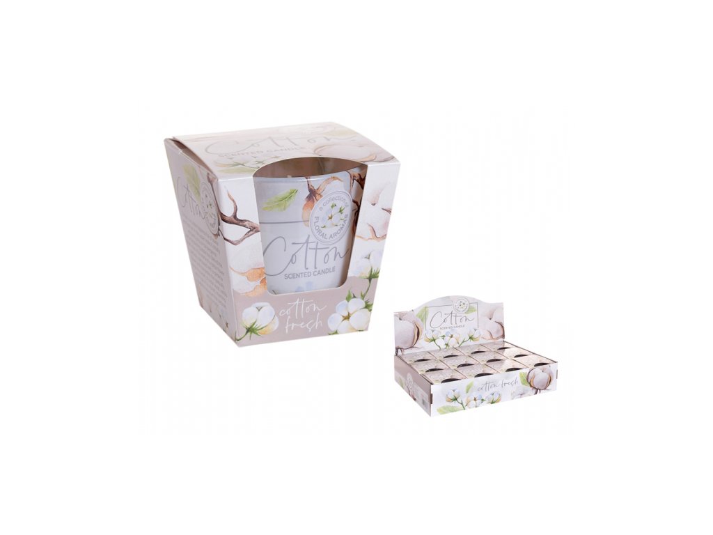 Vonná svíčka ve skle s jemným potiskem a svěží vůní bavlny. Doba hoření: 30 hodin. Výška: 8 cm, šířka: 9 cm.Doplňkové parametry
