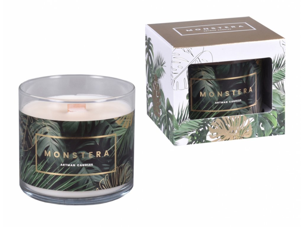 Vonná svíčka ve skle s vůní Monstery. Baleno v papírové krabičce s potiskem rostliny Monstery. Doba hoření: 86 hod. Hmotnost náplně: 400 g.Doplňkové parametry